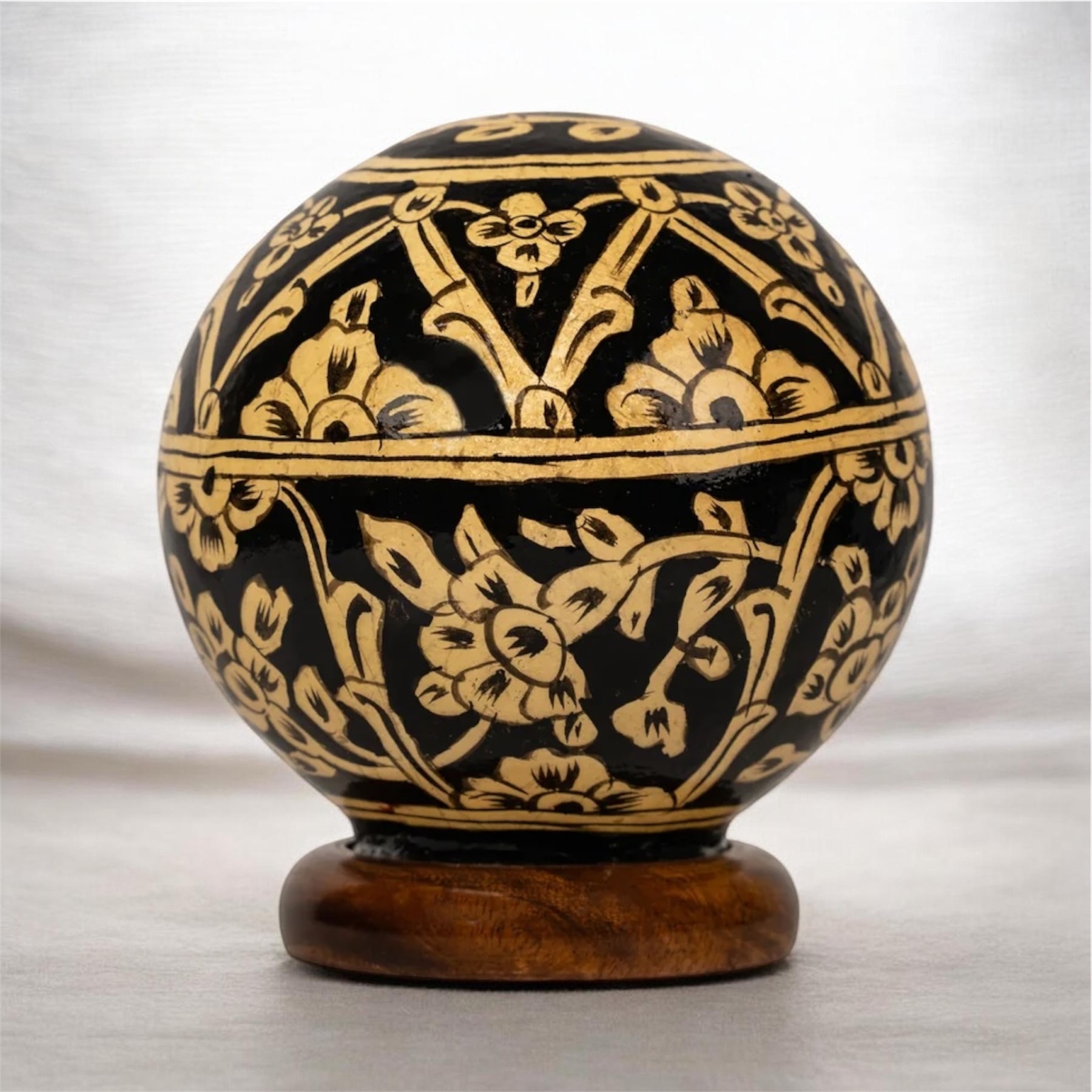 Glow your space and add an elegant touch with our Black Baku Camel Skin Round Lamp. Featuring intricate naqashi designs, this lamp is perfect for creating a warm and inviting atmosphere. Let the soft glow and cultural influence of this lamp enhance your home decor.