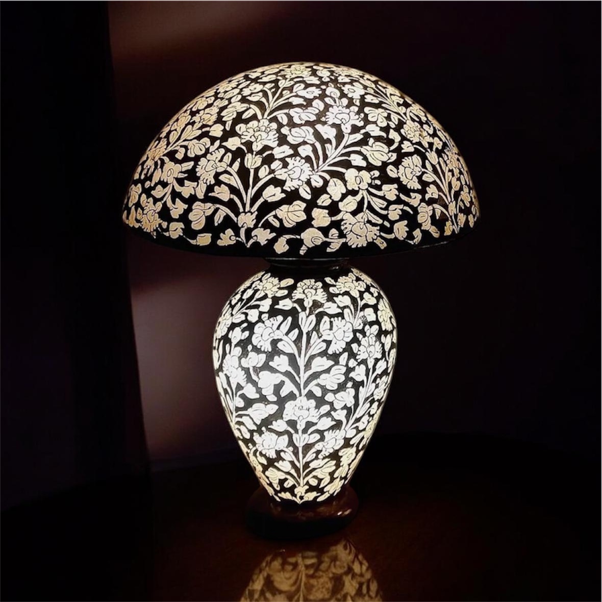 Glow your space and add an elegant touch with our Mushroom Shaped Camel Skin Lampshade. Featuring intricate naqashi designs, this lamp is perfect for creating a warm and inviting atmosphere. Let the soft glow and cultural influence of this lamp enhance your home decor.